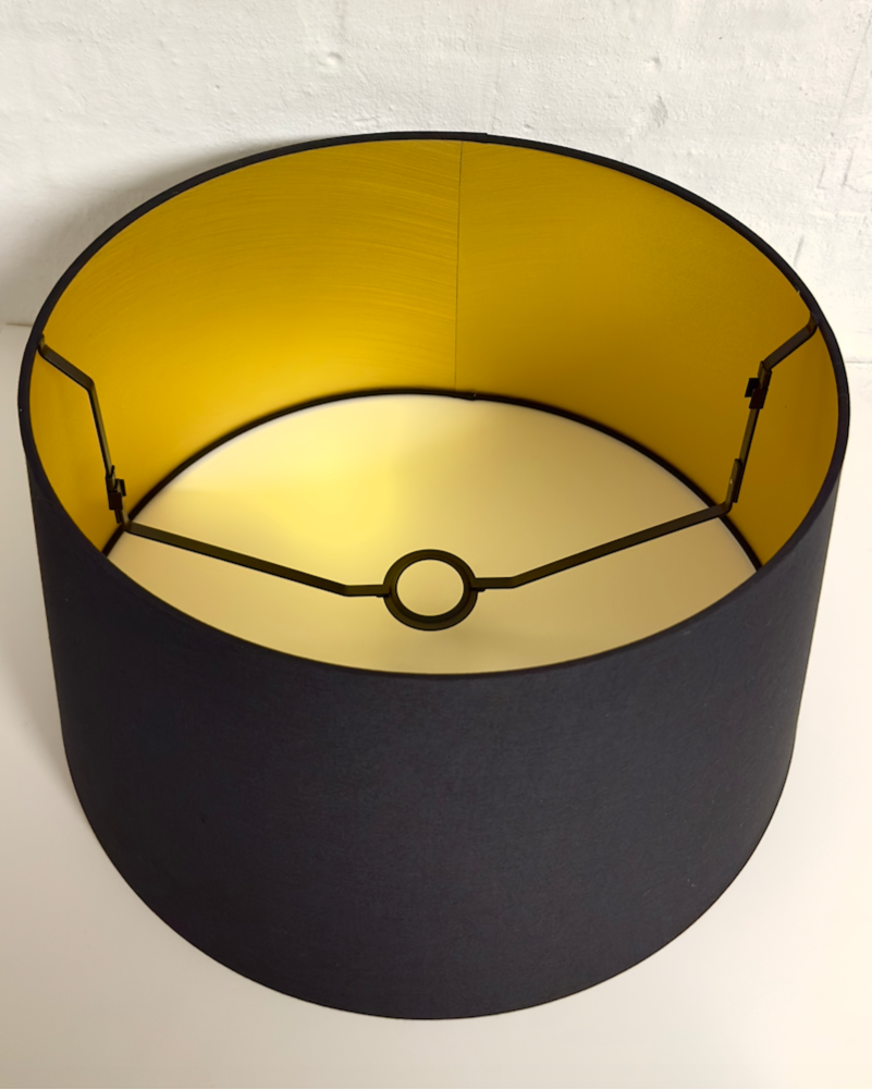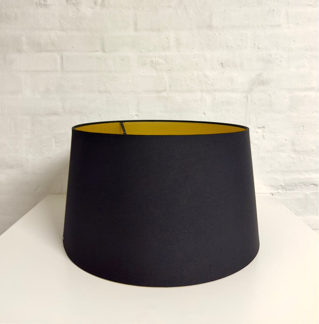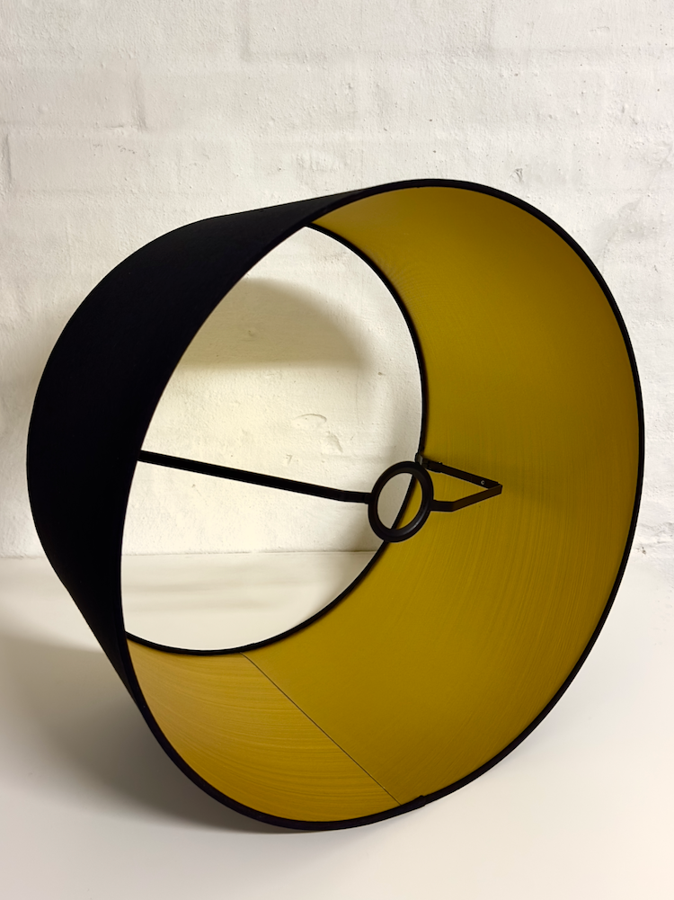 Ø35/40 bomuldsskærm, med en højde på 22 cm. Skærmen er kompatibel med E27 fatninger. Skærmen er sort med et gyldent indre. Justerbare arme indvendigt som gør skærmen velegnet til både stående og hængende lamper.
