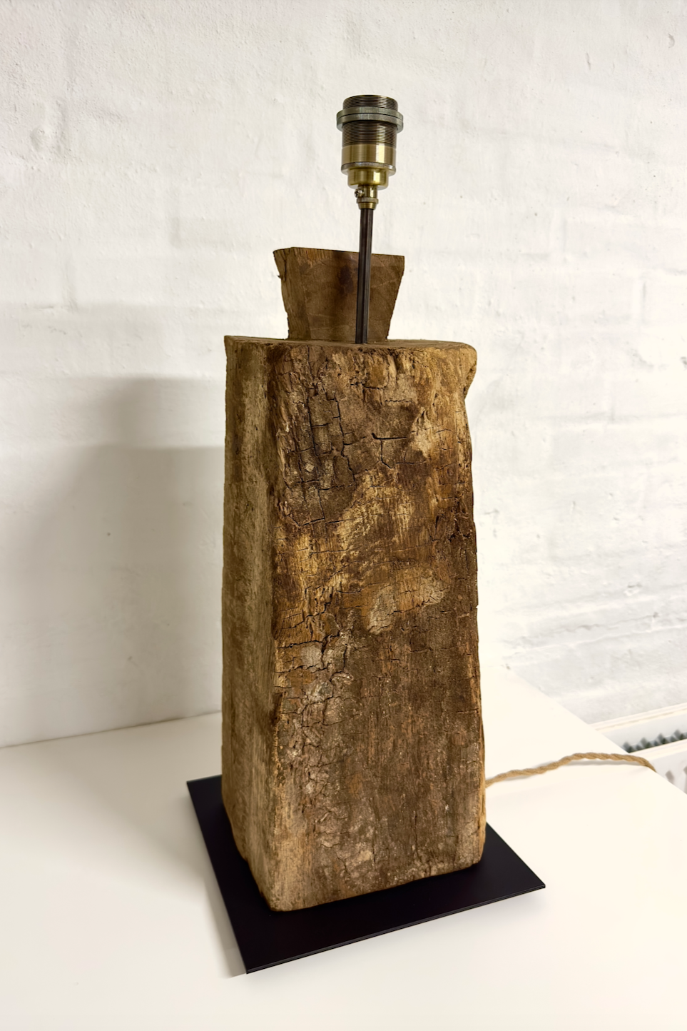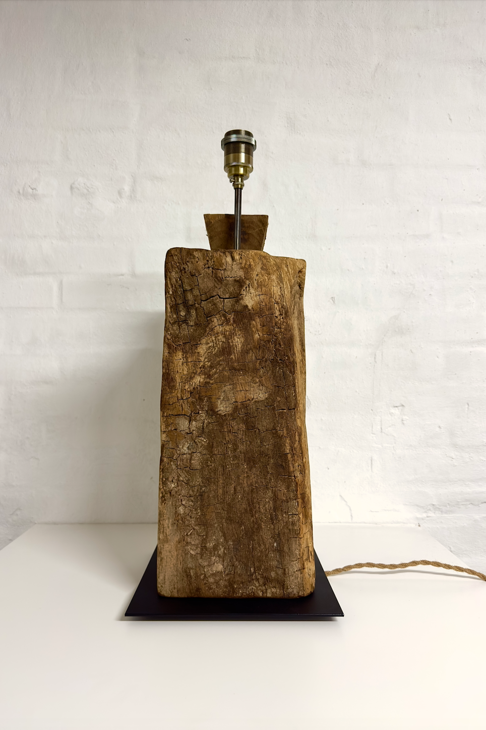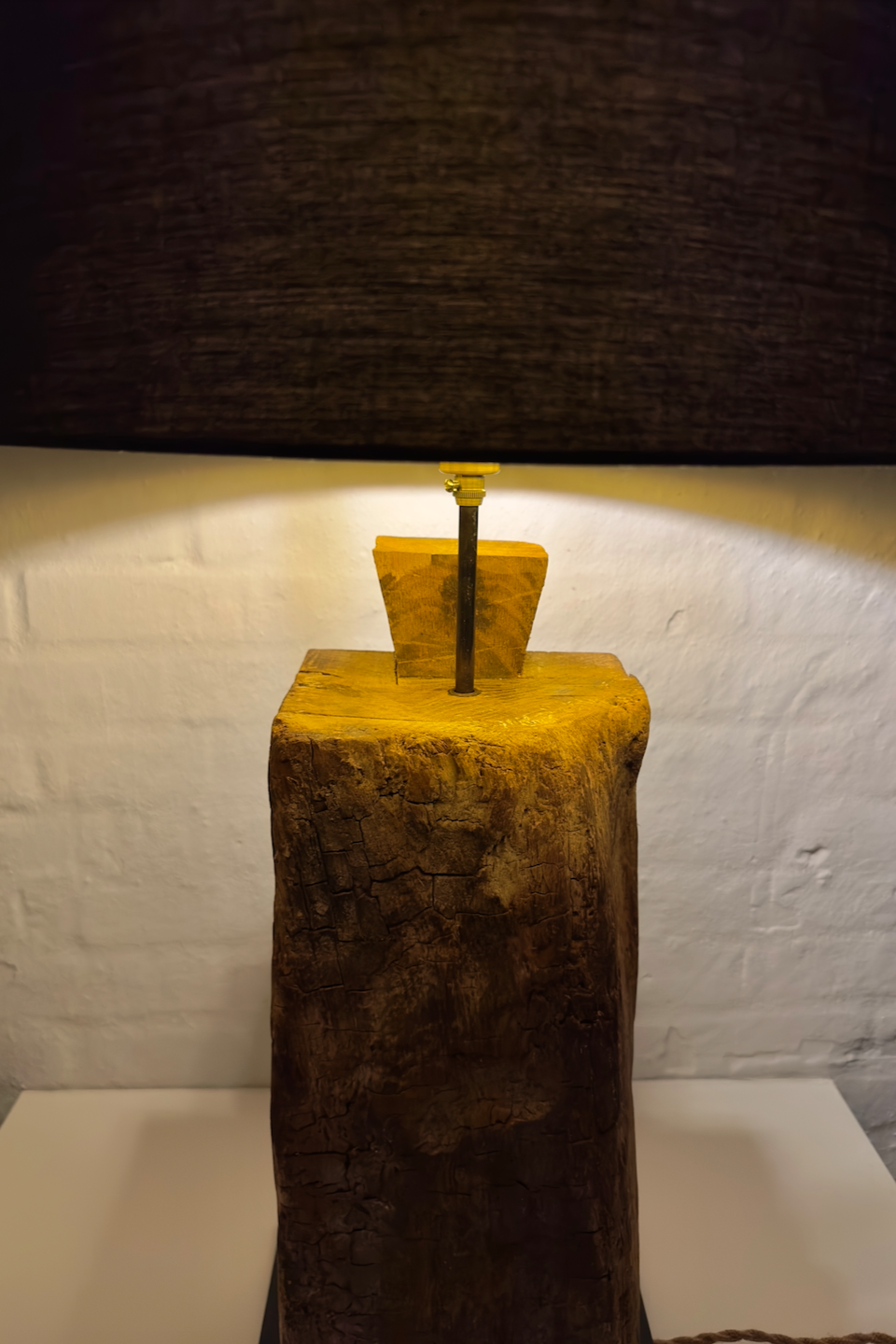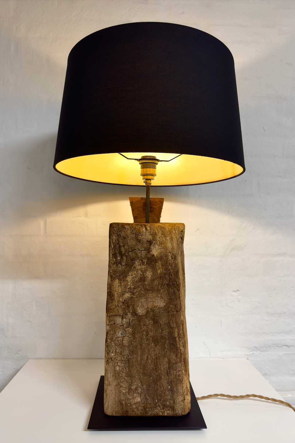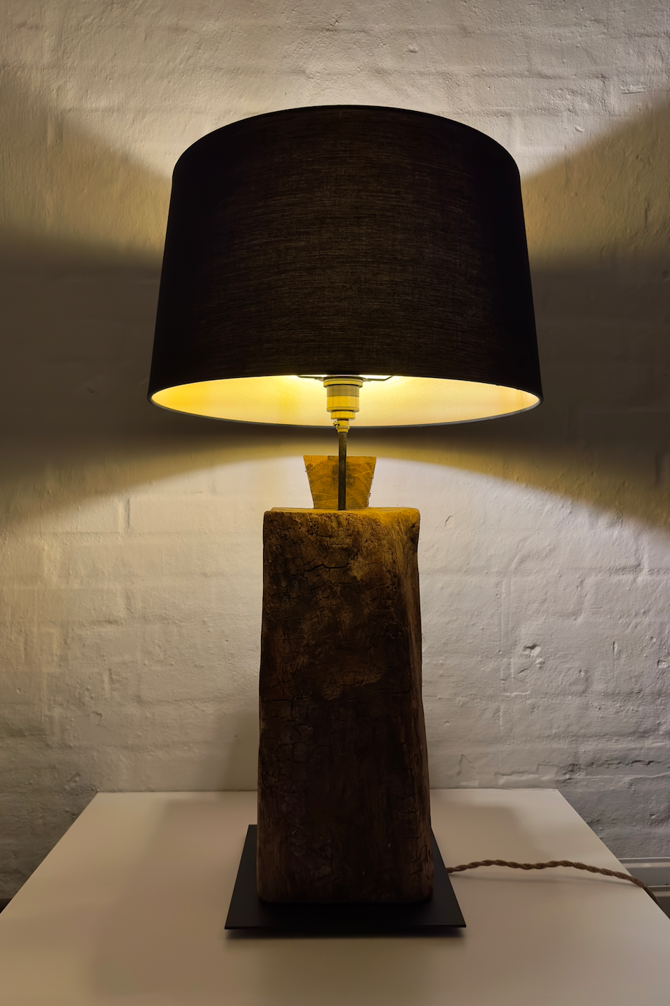 WoodLamp egetræs bordlampe lavet af gamle, historiske bjælker og spær fra historiske stalde som du kan læse mere om længere nede. Lampen måler cirka 62 cm i højden, og står på en plade som er 25 x 25 cm. Egetræet, der er brugt til lampen, har masser af patina i form af slid, huller, revner og andre charmerende detaljer. Træet har desuden fået en beskyttende behandling, for at beskytte træet på en naturlig måde, med respekt for dets alder og struktur, læs mere i beskrivelsen. De øvrige komponenter, som gevindstænger, fatninger og bundplade, er ligeledes udført i en rå og håndlavet stil, der komplementerer træets unikke look. Lampen leveres uden lampeskærm og pære, medmindre andet er valgt ved bestillingen. OBS. Lampen er designet som en funktionel og holdbar bordlampe. Vær dog forsigtig med at vride for meget i lampen, da den også er skabt som et kunstværk.