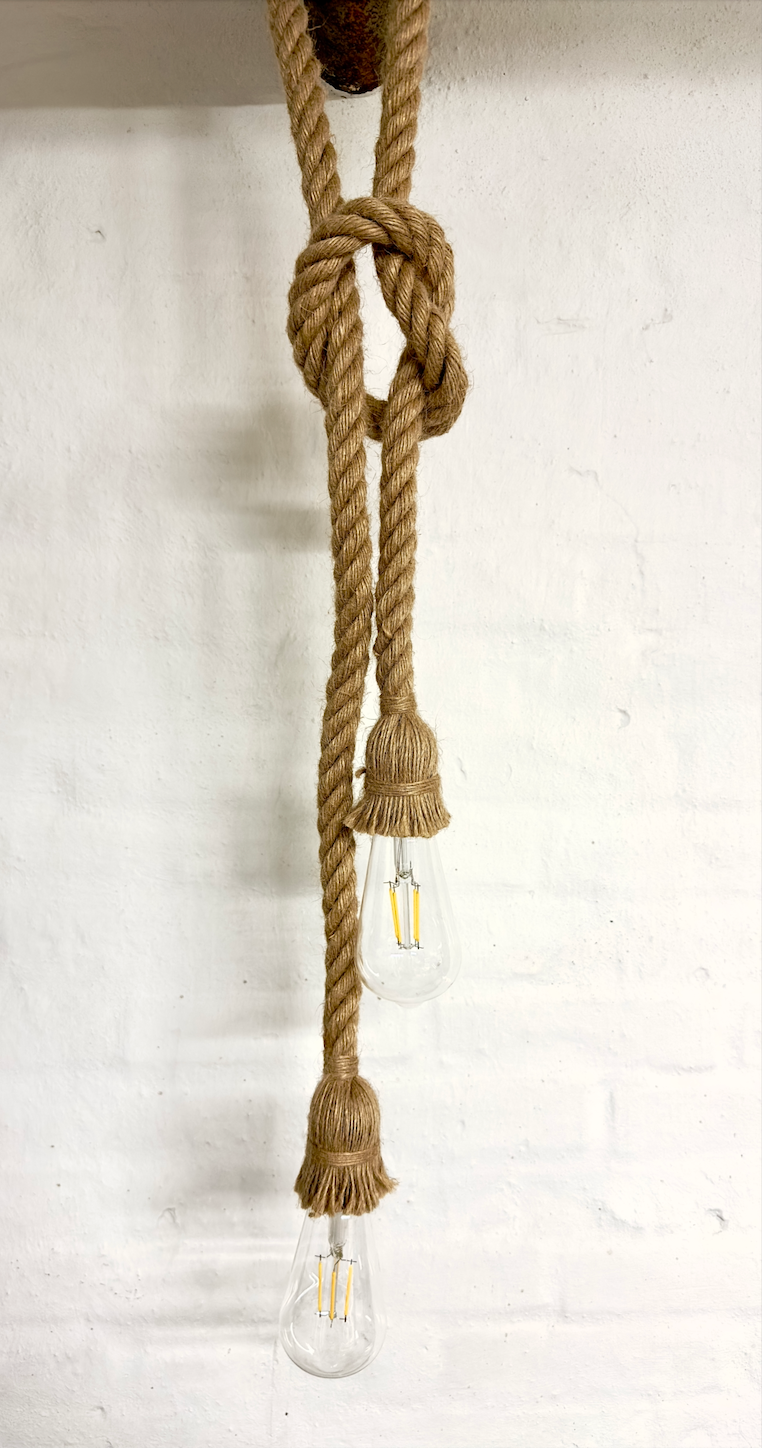 RopeLamp loftlampe er lavet af ledninger pakket ind i reb. Lampen måler cirka 2 x 95 cm i længden og har en loftplade til at skjule ledningerne med en diameter på 9,5 cm. I enden af lampen er der 2 x E27 fatninger til pærene. OBS. lampen leveres uden pære, medmindre andet er valgt ved bestillingen.