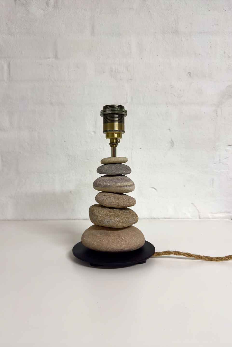 StoneCairn lampen i natursten kan bruges til at opdatere stuen, soveværelset, kontoret og mange andre rum. StoneCairn lampen kommer i en højde på ca. 28 cm. Stenenes størrelser variere fra den øverste sten på ca. Ø 5 cm. og den nederste sten på ca. Ø 12 cm. Stenene som bliver brugt variere i farver, former og størrelser da det er et naturmateriale som bliver anvendt, og ingen sten vil derfor ligne hinanden. De øvrige komponenter, som gevindstænger, fatninger og bundplade, er udført i en rå og håndlavet stil, der komplementerer stenenes rustikke look. Lampen leveres uden lampeskærm og pære, medmindre andet er valgt ved bestillingen. OBS. Lampen er designet som en funktionel og holdbar bordlampe. Vær dog forsigtig med at vride for meget i lampen, da den også er skabt som et kunstværk.