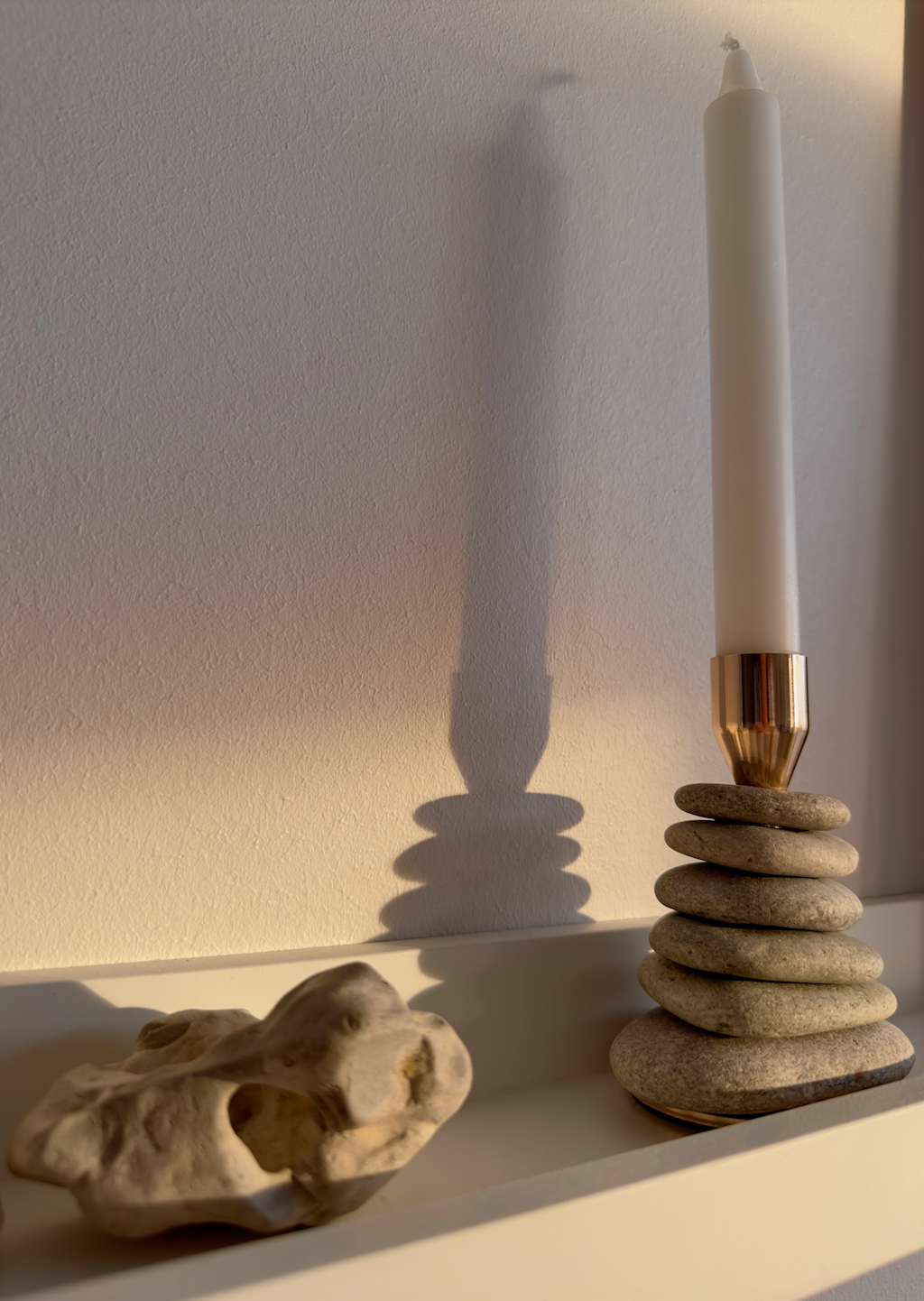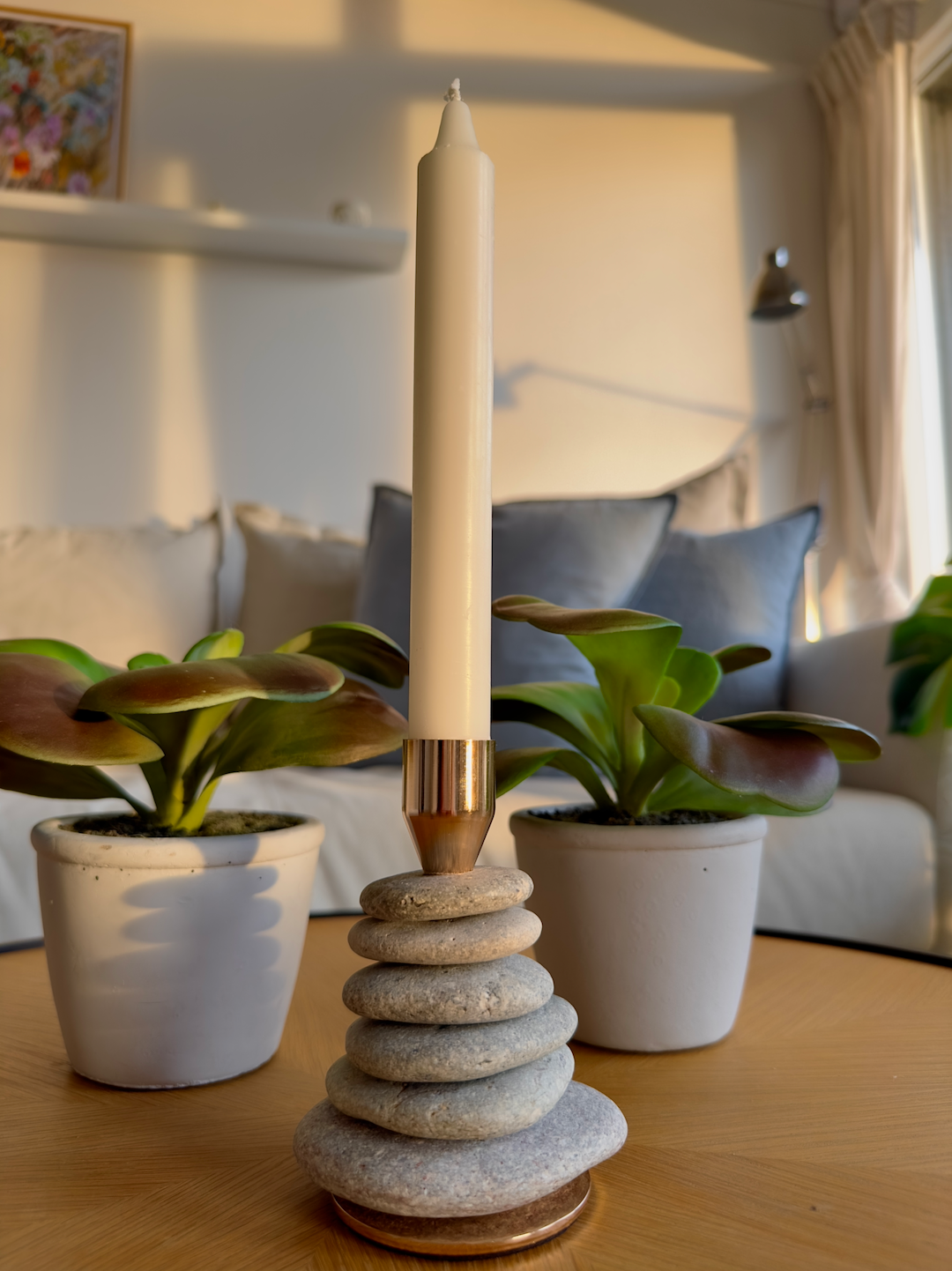 StoneCairn lysestage i natursten kan bruges til at opdatere dit badeværelse, soveværelse, stuen og mange andre rum. StoneCairn lysestagen kommer i en højde på ca. 20 cm. Stenenes størrelser variere fra den øverste sten på ca. Ø 5 cm. og den nederste sten på ca. Ø 12 cm. Stenene som bliver brugt variere i farver, former og størrelser da det er et naturmateriale som bliver anvendt, og ingen sten vil derfor ligne hinanden. OBS. Selvom det kan være fristende at teste stenens holdbarhed, anbefales det på det kraftigste IKKE at vride i dem. Bemærk, at det ikke er limen, men selve stenene, der risikerer at gå i stykker ved sådan behandling.