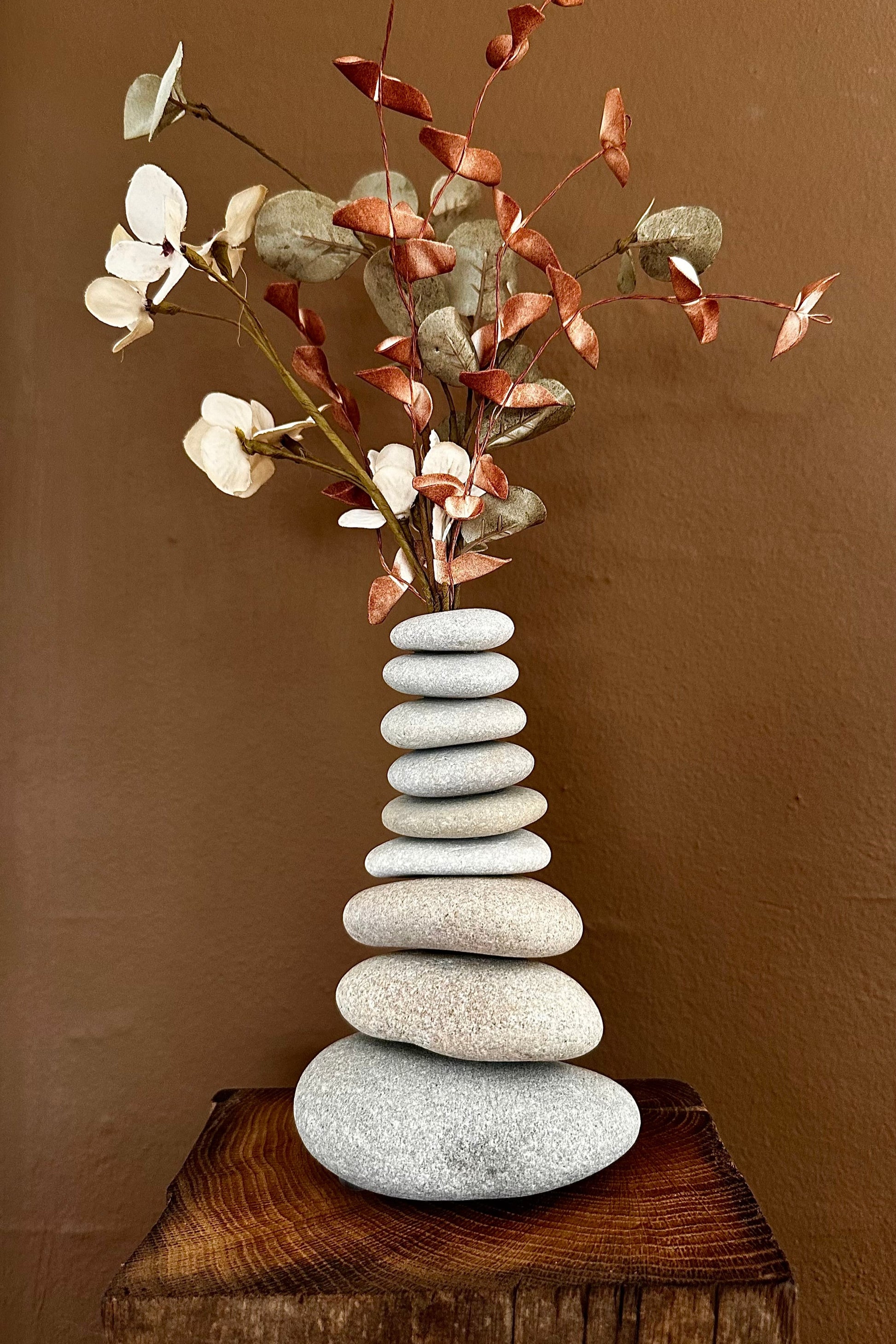 StoneCairn vase i natursten kan bruges til at opdatere dit badeværelse, soveværelse, stuen og mange andre rum. StoneCairn vasen kommer i en højde på ca. 25 cm. Stenenes størrelser variere fra den øverste sten på ca. Ø 5 cm. og den nederste sten på ca. Ø 12 cm. Stenene som bliver brugt variere i farver, former og størrelser da det er et naturmateriale som bliver anvendt, og ingen sten vil derfor ligne hinanden. Bemærk venligst, at vasen ikke er egnet til planter, der kræver vand, da den ikke kan indeholde vand. OBS. Selvom det kan være fristende at teste stenens holdbarhed, anbefales det på det kraftigste IKKE at vride i dem. Bemærk, at det ikke er limen, men selve stenene, der risikerer at gå i stykker ved sådan behandling.