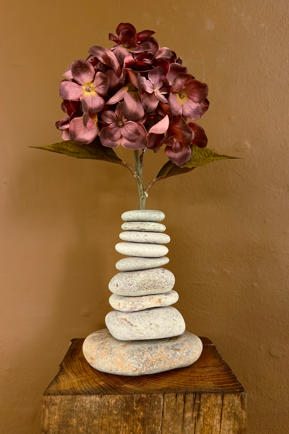 StoneCairn vase i natursten kan bruges til at opdatere dit badeværelse, soveværelse, stuen og mange andre rum. StoneCairn vasen kommer i en højde på ca. 25 cm. Stenenes størrelser variere fra den øverste sten på ca. Ø 5 cm. og den nederste sten på ca. Ø 12 cm. Stenene som bliver brugt variere i farver, former og størrelser da det er et naturmateriale som bliver anvendt, og ingen sten vil derfor ligne hinanden. Bemærk venligst, at vasen ikke er egnet til planter, der kræver vand, da den ikke kan indeholde vand. OBS. Selvom det kan være fristende at teste stenens holdbarhed, anbefales det på det kraftigste IKKE at vride i dem. Bemærk, at det ikke er limen, men selve stenene, der risikerer at gå i stykker ved sådan behandling.
