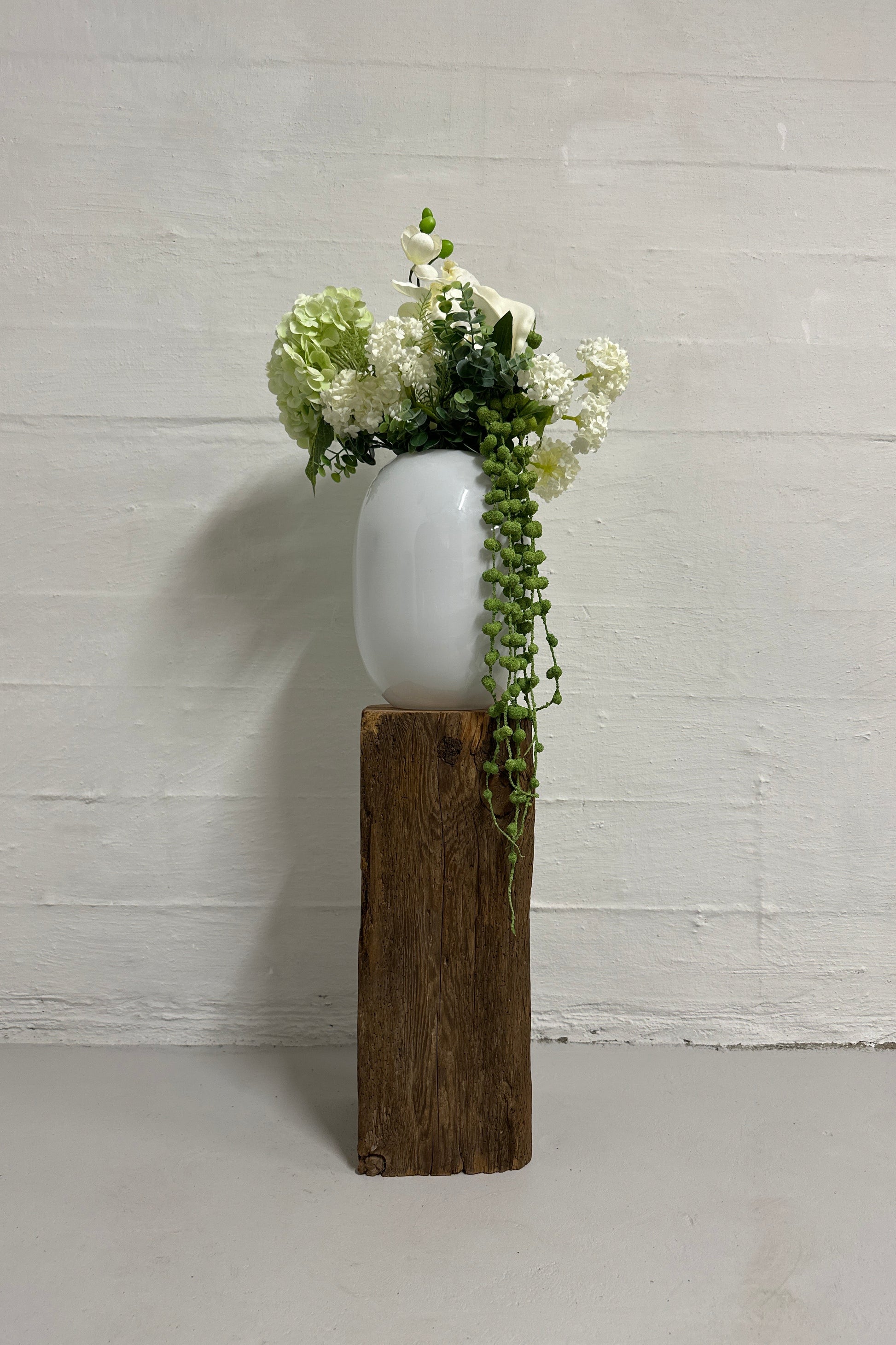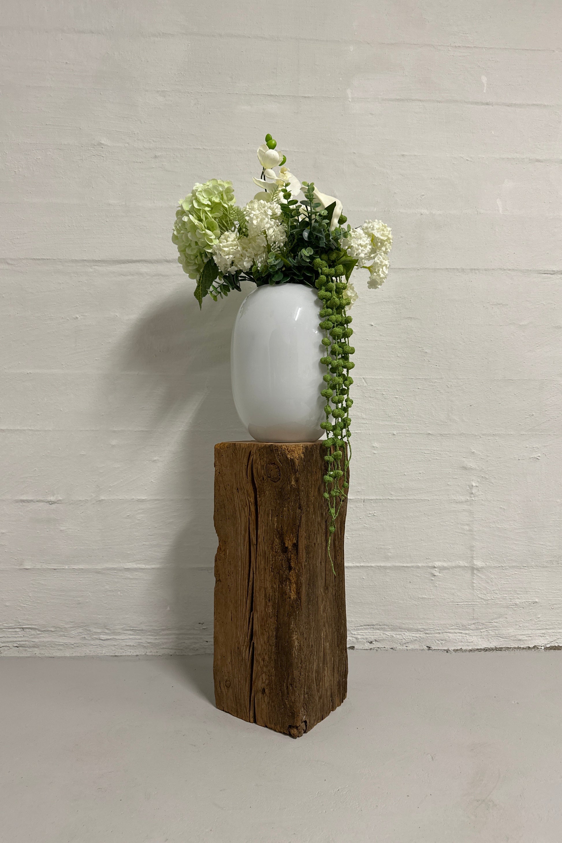 Denne piedestal er lavet af gamle, historiske fyrretræsbjælker, der har bevaret deres karakter og skønhed gennem årene. Hvert stykke træ er nøje udvalgt for dets unikke patina, der fortæller historier om fortiden med sine slidmærker, huller og revner. Disse spor af tidens gang giver piedestalen en autentisk og rustik charme, som er umulig at replikere med nyt træ. Piedestalen er solid og robust, konstrueret af massivt fyrretræ. Det historiske træ er omhyggeligt bearbejdet for at bevare sin naturlige skønhed, mens det også er blevet forstærket for moderne brug. Med sine tydelige spor af tidens tand, såsom slid, huller og revner, udstråler denne piedestal en rustik elegance, der kan komplementere både traditionelle og moderne indretninger. Den fungerer perfekt som en piedestal til kunstværker, planter, skulpturer eller andre dekorative genstande, og dens tidløse design gør den til et stykke møbelkunst i sig selv. Den dybe historie, der er indlejret i hvert stykke træ, gør denne piedestal til mere end bare et møbel; det er et stykke levende historie. De gamle bjælker, der engang har tjent i historiske bygninger, bringer med sig en følelse af autenticitet og karakter, der tilfører ethvert rum en unik fortælling.