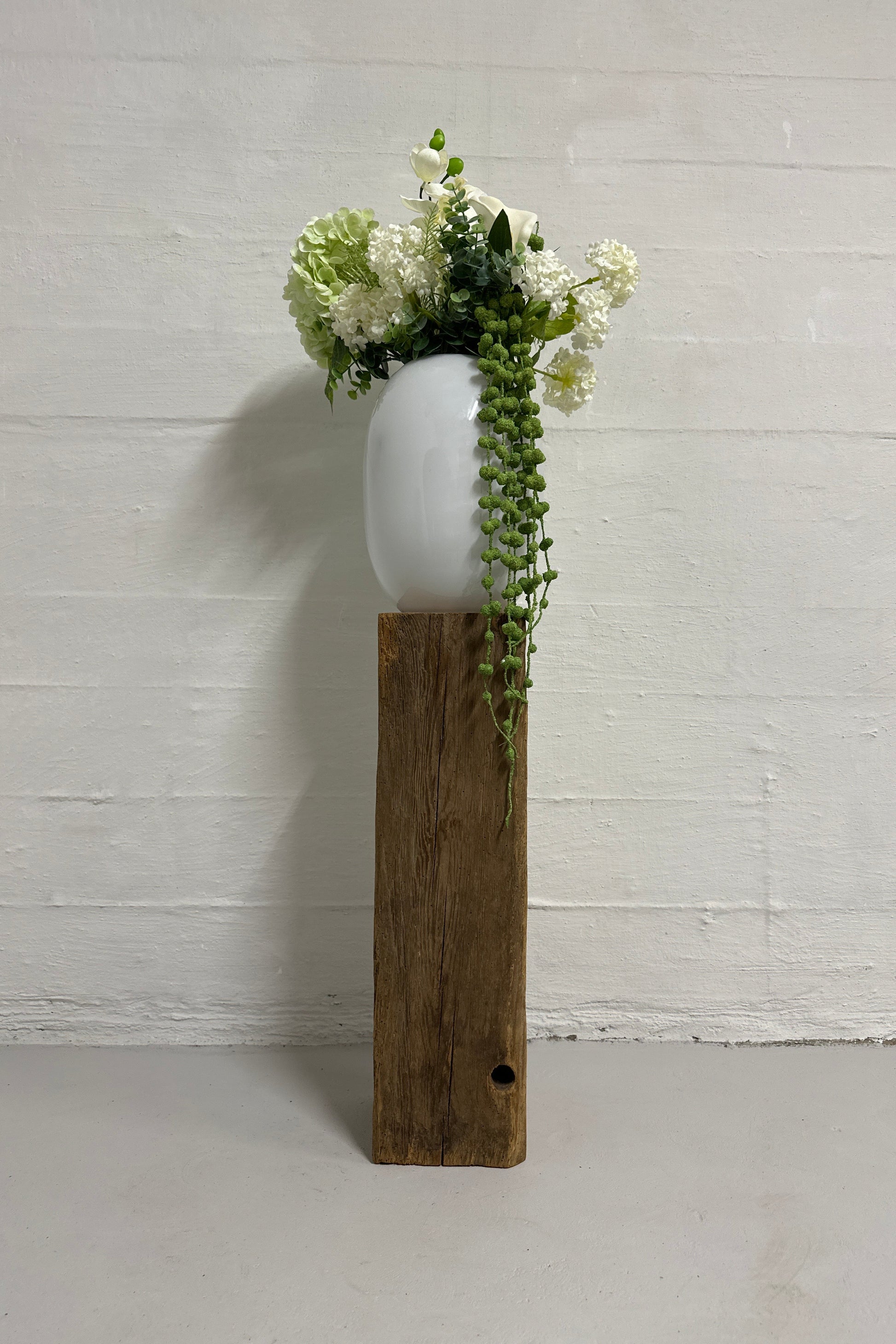 Denne piedestal er lavet af gamle, historiske fyrretræsbjælker, der har bevaret deres karakter og skønhed gennem årene. Hvert stykke træ er nøje udvalgt for dets unikke patina, der fortæller historier om fortiden med sine slidmærker, huller og revner. Disse spor af tidens gang giver piedestalen en autentisk og rustik charme, som er umulig at replikere med nyt træ. Piedestalen er solid og robust, konstrueret af massivt fyrretræ. Det historiske træ er omhyggeligt bearbejdet for at bevare sin naturlige skønhed, mens det også er blevet forstærket for moderne brug. Med sine tydelige spor af tidens tand, såsom slid, huller og revner, udstråler denne piedestal en rustik elegance, der kan komplementere både traditionelle og moderne indretninger. Den fungerer perfekt som en piedestal til kunstværker, planter, skulpturer eller andre dekorative genstande, og dens tidløse design gør den til et stykke møbelkunst i sig selv. Den dybe historie, der er indlejret i hvert stykke træ, gør denne piedestal til mere end bare et møbel; det er et stykke levende historie. De gamle bjælker, der engang har tjent i historiske bygninger, bringer med sig en følelse af autenticitet og karakter, der tilfører ethvert rum en unik fortælling.