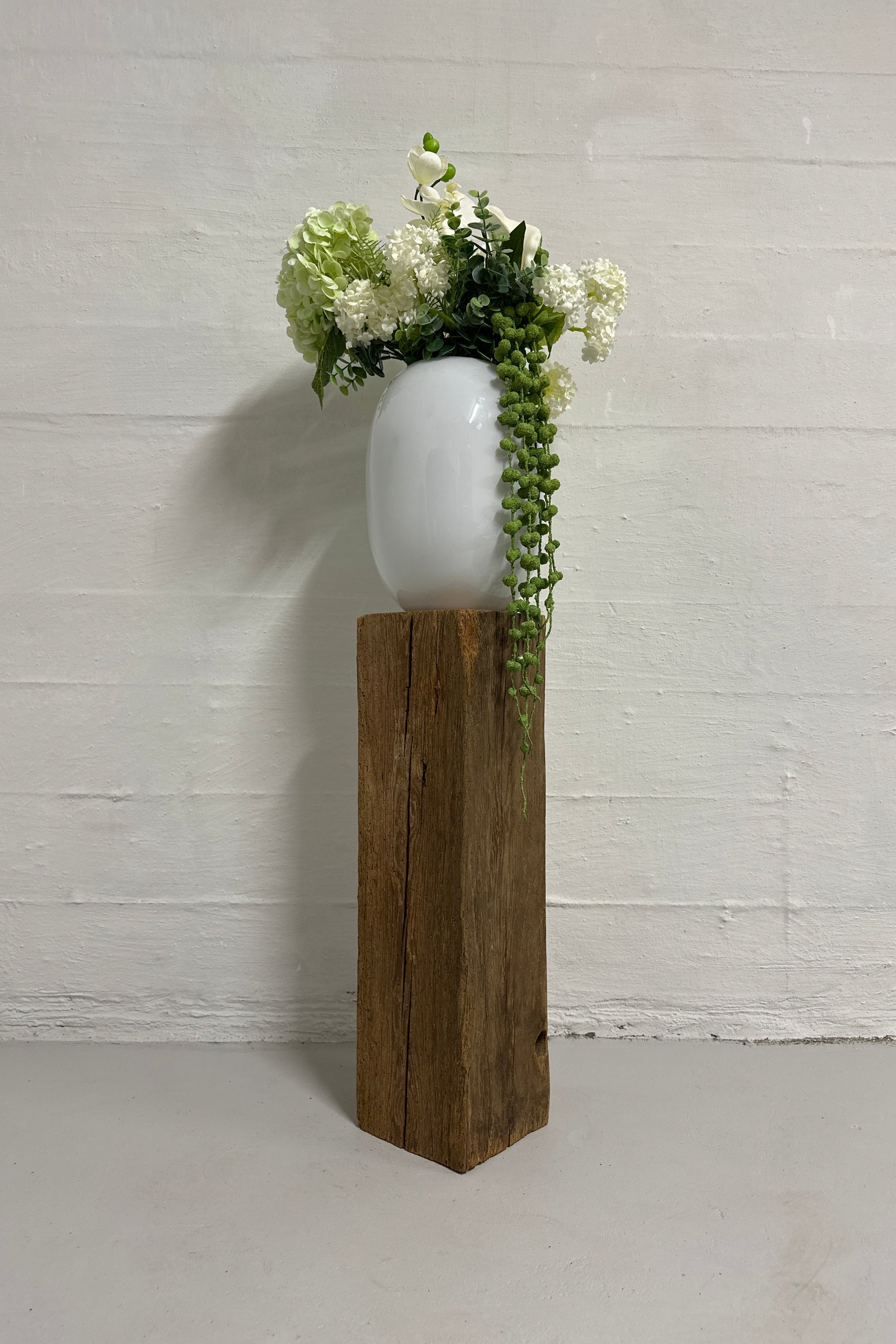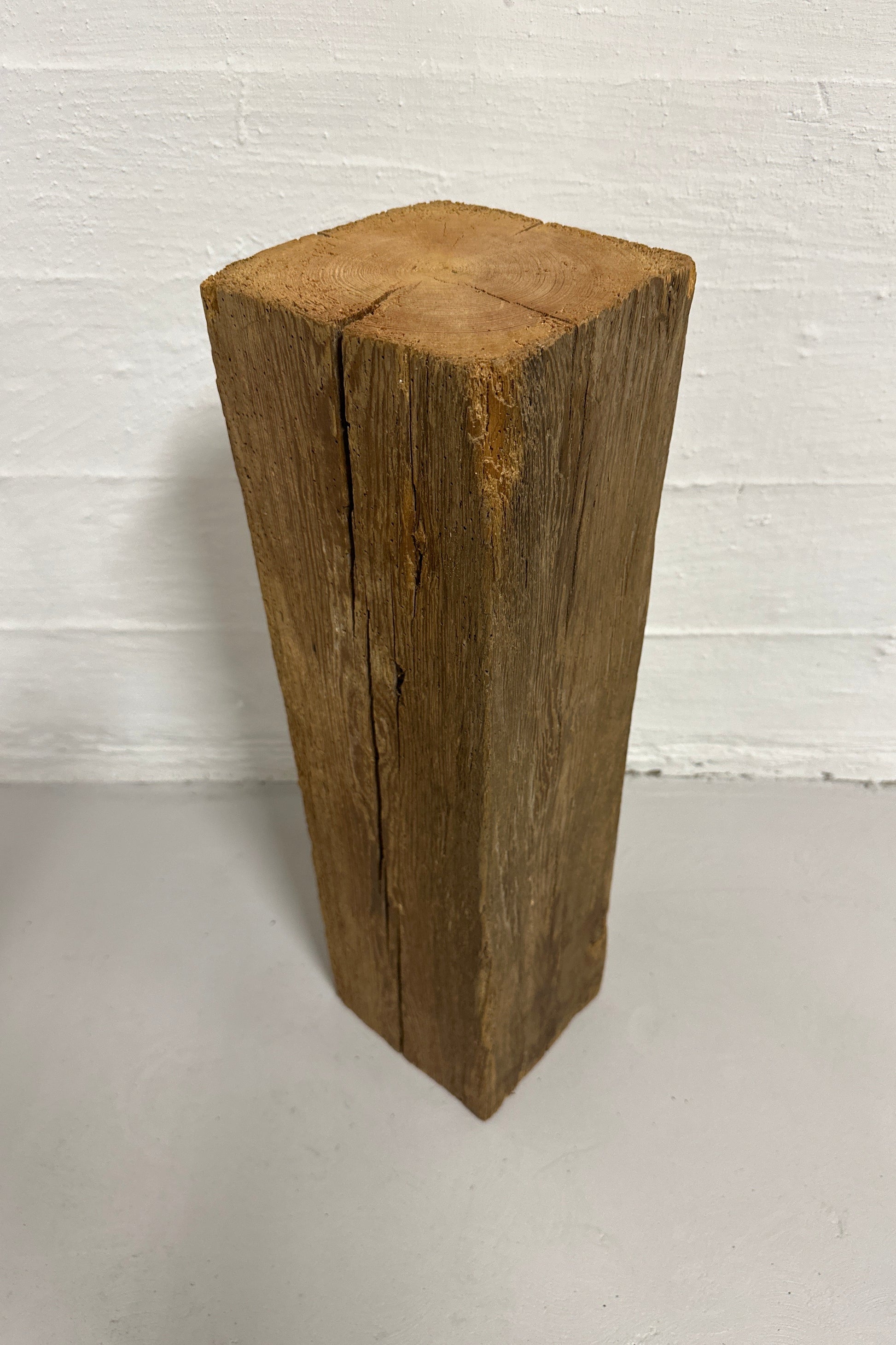 WoodPiedestal mellem i fyrretræ. Piedestalen er lavet af gamle, historiske bjælker og spær fra historiske stalde som du kan læse mere om længere nede. Piedestalen har desuden fået en beskyttende behandling, for at beskytte træet på en naturlig måde, med respekt for dets alder og struktur, læs mere i beskrivelsen. Piedestalen måler cirka 60,5 cm i højden, 17,5 cm i bredden og 17,5 cm i dybden. Fyrretræet, der er brugt til piedestalen, har masser af patina i form af slid, huller, revner og andre charmerende detaljer.