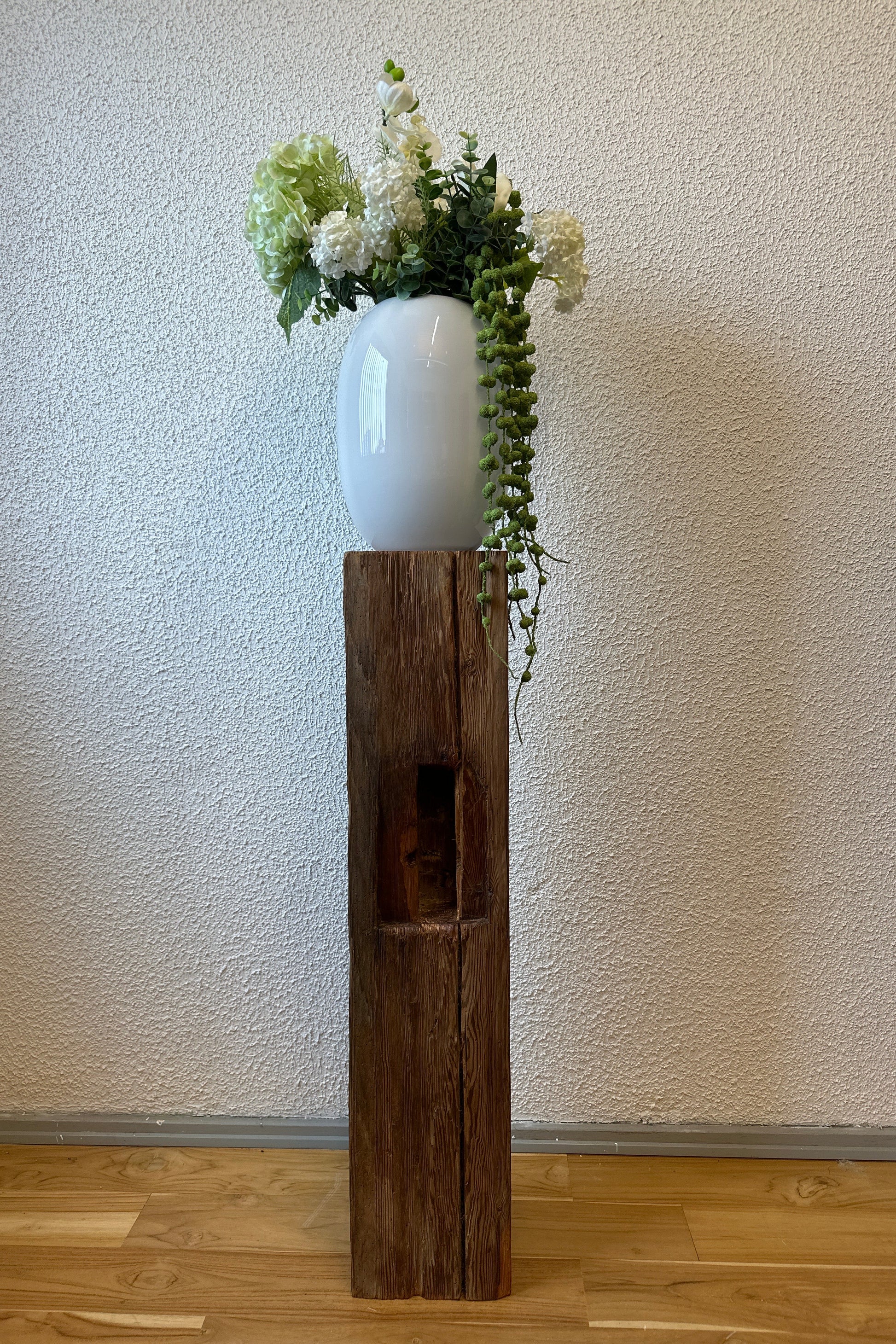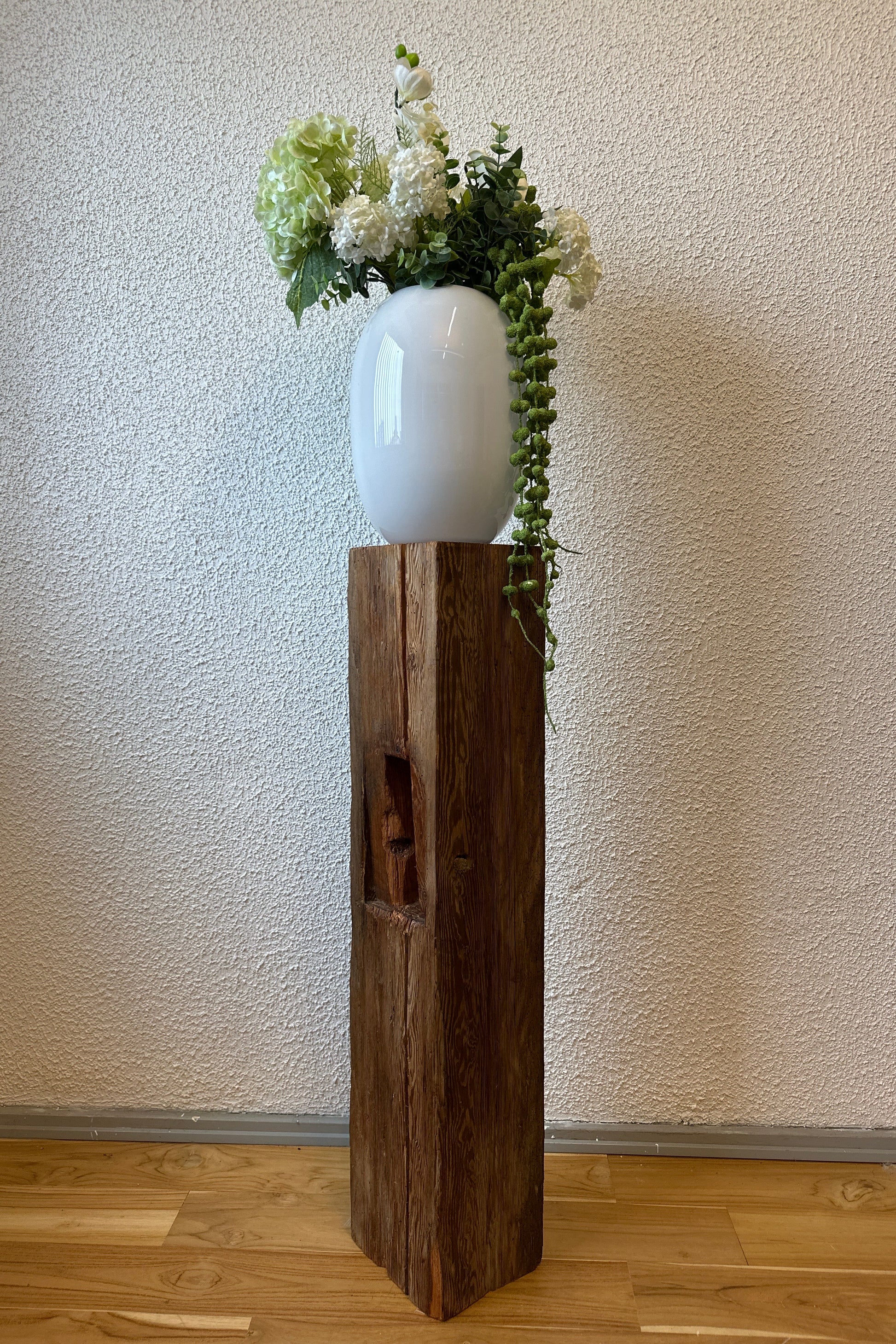 Denne piedestal er lavet af gamle, historiske fyrretræsbjælker, der har bevaret deres karakter og skønhed gennem årene. Hvert stykke træ er nøje udvalgt for dets unikke patina, der fortæller historier om fortiden med sine slidmærker, huller og revner. Disse spor af tidens gang giver piedestalen en autentisk og rustik charme, som er umulig at replikere med nyt træ. Piedestalen er solid og robust, konstrueret af massivt fyrretræ. Det historiske træ er omhyggeligt bearbejdet for at bevare sin naturlige skønhed, mens det også er blevet forstærket for moderne brug. Med sine tydelige spor af tidens tand, såsom slid, huller og revner, udstråler denne piedestal en rustik elegance, der kan komplementere både traditionelle og moderne indretninger. Den fungerer perfekt som en piedestal til kunstværker, planter, skulpturer eller andre dekorative genstande, og dens tidløse design gør den til et stykke møbelkunst i sig selv. Den dybe historie, der er indlejret i hvert stykke træ, gør denne piedestal til mere end bare et møbel; det er et stykke levende historie. De gamle bjælker, der engang har tjent i historiske bygninger, bringer med sig en følelse af autenticitet og karakter, der tilfører ethvert rum en unik fortælling.